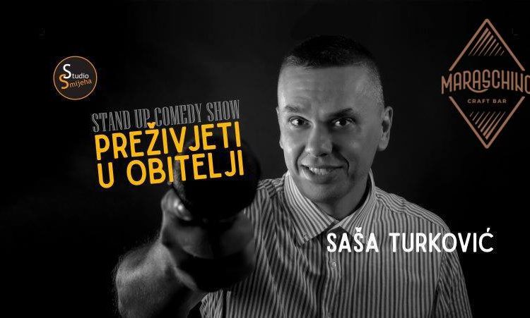 Najomiljeniji “obiteljski” stand up stupa na scenu! Razgibajte mišiće lica i spremite se za bore smijalice jer u Varaždin dolazi Saša Turković i njegov show PreŽivjeti u obitelji! Osim bogatog komičarskog iskustva Saša je i vrlo iskusan suprug i otac te će u svom prvom showu pričati o klasičnim problemima jedne sasvim (NE)obične hrvatske obitelji, ratama za kredit, neplaćenim računima, djeci, đeparcu… Naš se Saša u obiteljskom životu snalazi kao i Bear Grylls u divljini, a ako vas zanima kako dođite ga poslušati i nasmijati se njegovim “trikovima” i još boljim savjetima. Najstariji (godinama, a ne stažem) stalni komičar studija smijeha … fore izvodi brzo jer osjeća da mu nije ostalo još puno vremena. Otac je troje djece (barem prema službenim dokumentima) koje, na njihov užas i usprkos njihovu negodovanju, često spominje u svojim nastupima. Preko dana vodi vlastitu tvrtku, a navečer odlazi na nastupe u Studio Smijeha – ženi laže da ide na terapiju za vodu u koljenu. Osim stand up-om, bavi se life coachingom i motivacijskim govorništvom što dovodi do učestalih zabuna … nakon nekih njegovih izjava publika nije sigurna dali bi se trebala smijati ili odraditi trening u teretani. Nastojimo mu dati priliku da nastupa što ranije jer nakon što popije svoje ljekove za reumu u 22h … teško ostaje budan. Misli su mu prljave, a humor čist … bez previše psovki i vulgarnosti. Saša malo slabije čuje i ne govori Mađarski, tako da, ako mu se želite obratiti tijekom nastupa, molimo Vas da govorite glasnije i nikako ne na Mađarskom. Ovaj show odličan je šlag na torti vašeg romantičnog izlaska na Valentinovo tako da svoje ulaznice za 14.2. rezervirajte čim prije budući da im je broj ograničen sjedećim mjestima. Cijena ulaznice je 25 kuna. Rezervacije i pretprodaja preko Maraschino Craft bara. *Konzumacija pića u klubu je obavezna